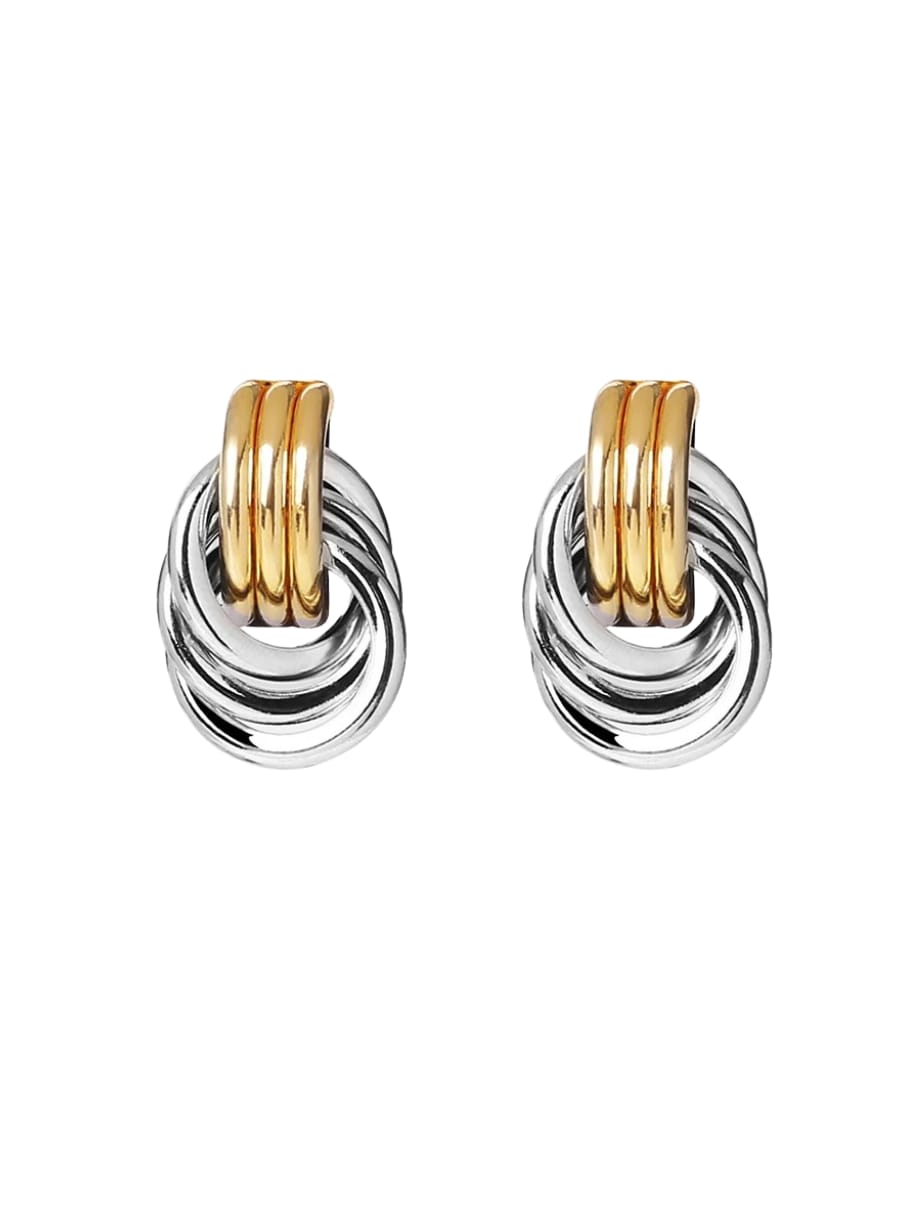 The new oversized statement stud earrings. A chunky mixed metal knot statement earring. Interlinked curved bars of gold and silver.