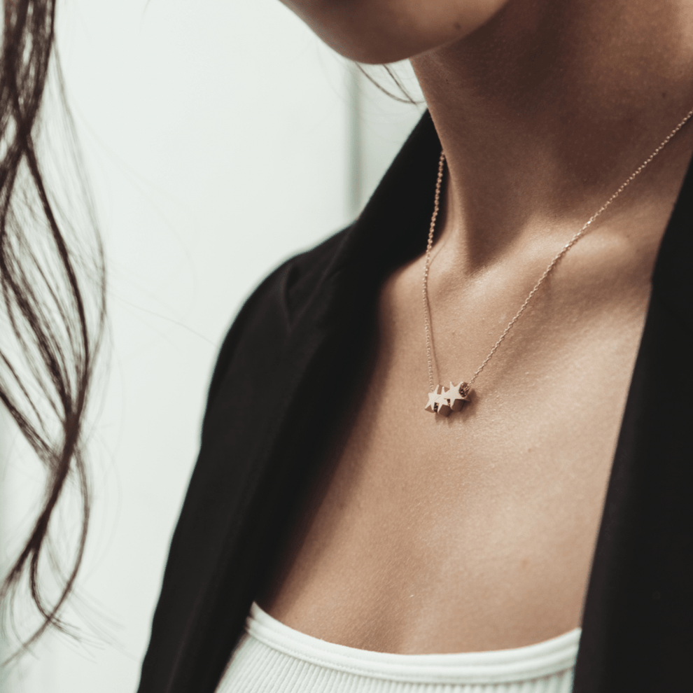 A delicate fine chain gold bracelet from Betty and Biddy with a trio of star charms.