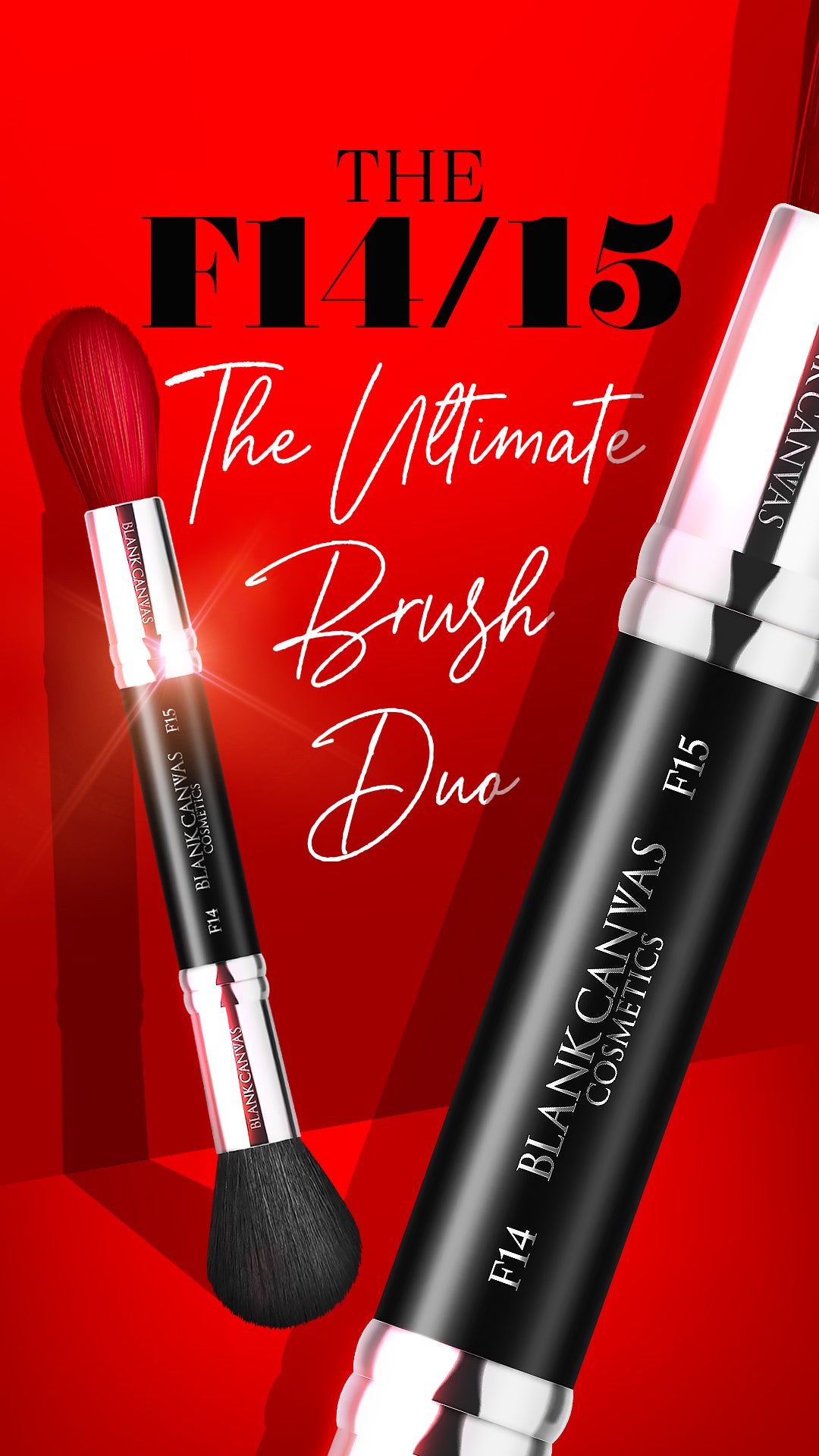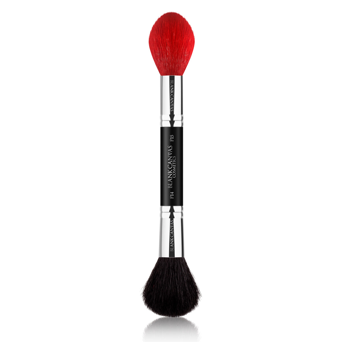 Blank Canvas F14/F15 Dual Ended Face Brush combines 2 bestselling face brushes in one - the F14 Round Cheek Brush and F15 Small Contour and Highlight brush.