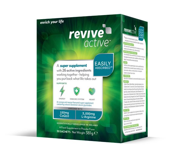 Each sachet contains 26 active ingredients that are carefully chosen to work in synergy once activated. Revive Active is a comprehensive blend of vitamins, minerals and amino acids including B6, B12, C and D, folate, thiamine, copper, zinc and selenium and it is enriched with 150mg of CoEnzyme Q10 (CoQ10) and 3,000mg of L-Arginine