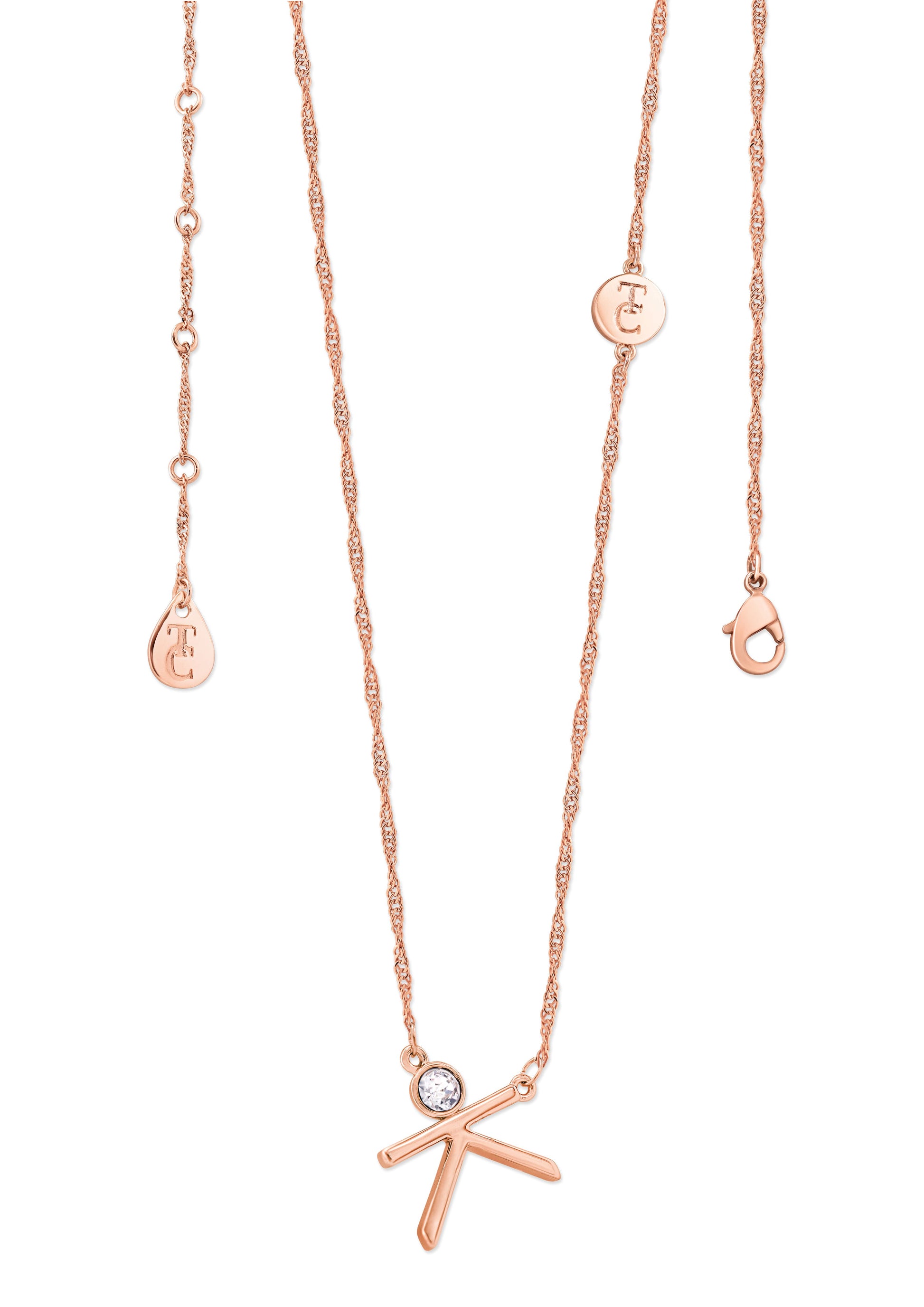 Crafted in sleek polished rose gold, each unique letter is adorned with a sparkling bezel set clear CZ adding a touch of glamour to these eyecatching pendants. Each letter is positioned at an angle creating a contemporary look. They are suspended from a beautiful shimmering Singapore chain and secure safely with a lobster claw clasp.