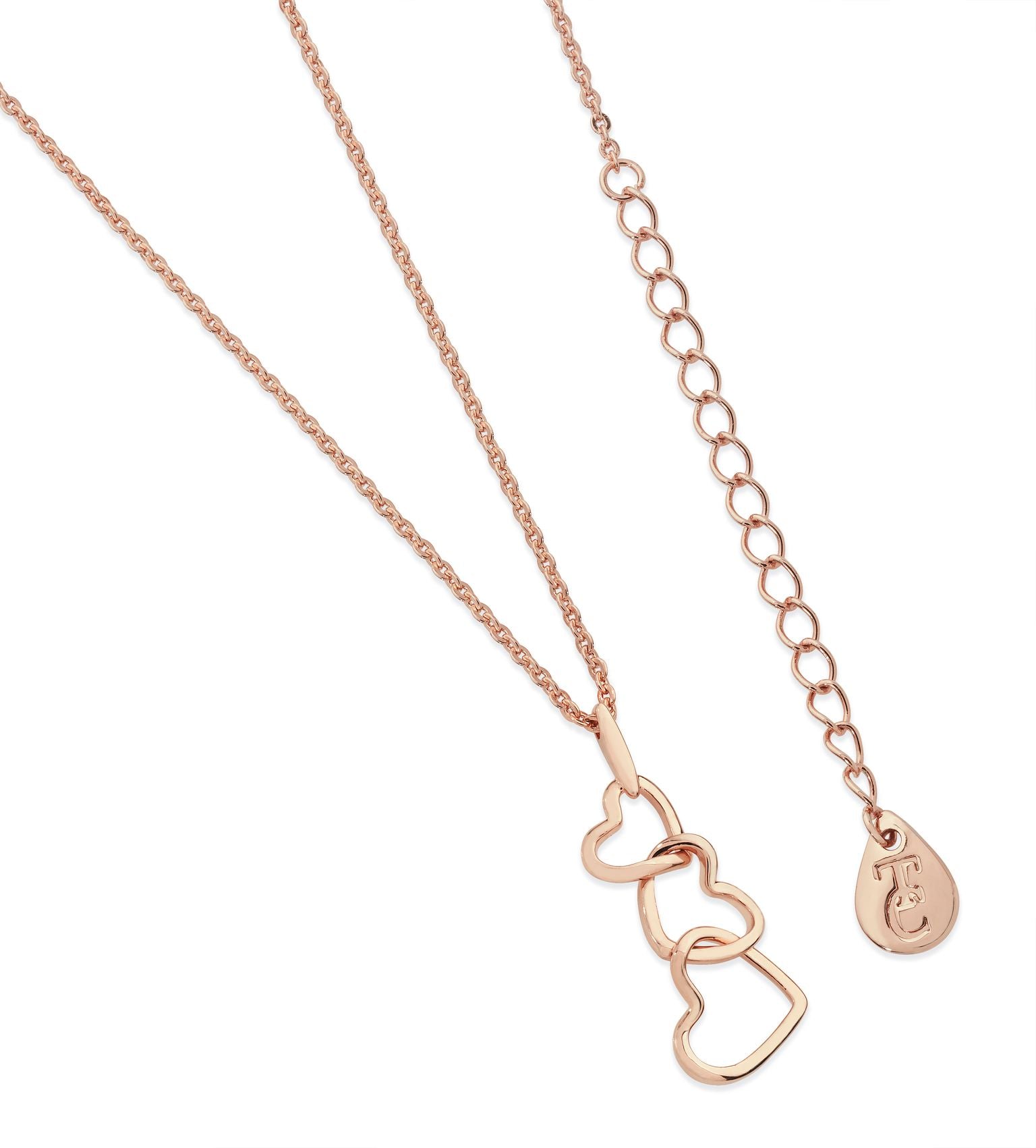 In soft, romantic rose gold this dainty heart pendant is the perfect way to say “I love you”. Three graduating open hearts are interlinked in a clever linear drop which suspends from a sleek bale which runs freely along a cable chain. A useful 2” extension chain and TC branded fob completes the elegant look.