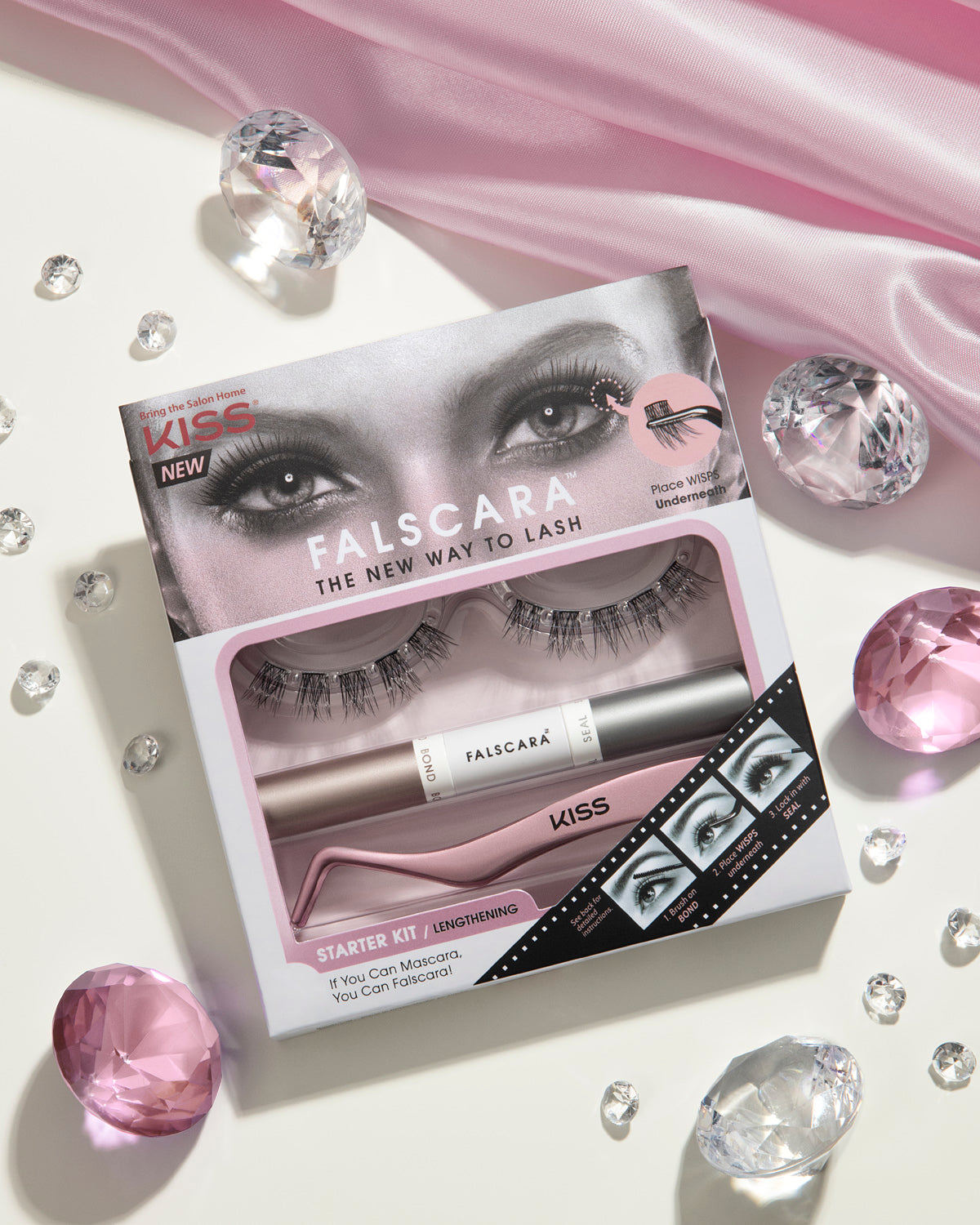 The Kiss Falscara Starter Kit (Lengthening) includes everything you need to get started! Falscara offers the speed of mascara with a true lash extension effect. If you can mascara then you can Falscara, that's for sure. No clumps, no smudges, no strips and no damage to your natural lashes.